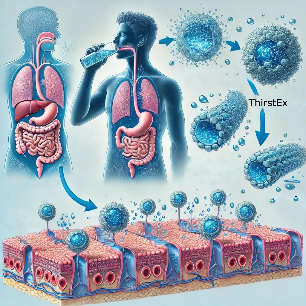Upon ingestion, ThirstEx® is rapidly absorbed through the gastrointestinal tract, distributing vital hydration to tissues and organs. By enhancing cellular osmoregulation and thermoregulation, ThirstEx® supports cognitive function, cardiovascular efficiency, and muscle performance.